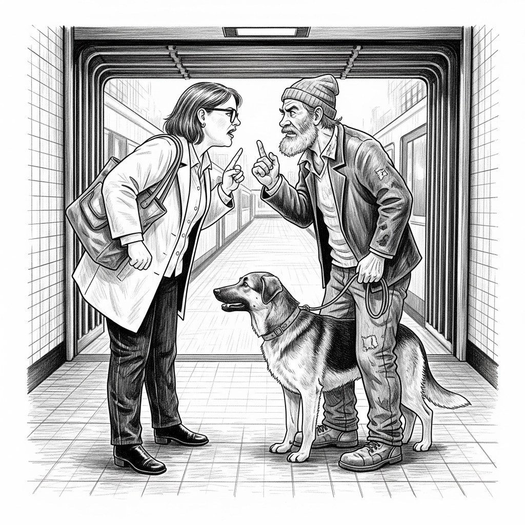 A metró bejárata mellett egy hajléktalan férfi ül a földre terített hálózsákján. Mellette néhány szatyor, benne ruhák. A koldus előtt egy koszos műanyag tál hever, néhány marék fémpénz van benne. A férfi mellett fekszik a kutyája. A nagy melegben liheg. Előtte egy üres műanyag tányér. Tőlük néhány méterre egy jól szituált középkorú nő éppen valakinek telefonál, miközben a szemét le sem veszi a koldusról.